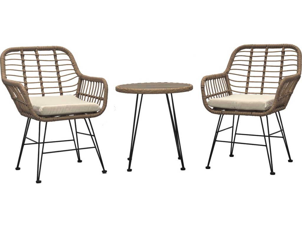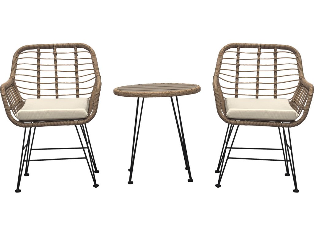Relaxační set stůl + 2 židle, kov, umělý ratan, látka béžová, deska stolku polywood