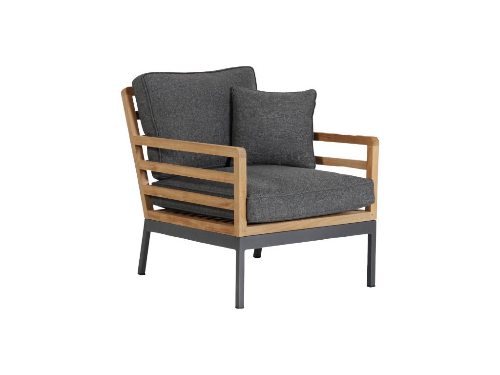 Elegantné kreslo Zalongo, ktoré kombinuje vysoko kvalitný teak s hliníkom v antracitovej farbe. Rovné teakové rebrá umocňujú dojem kvality a zároveň elegancie. Dva vankúše a spodný sedák sú súčasťou kresla.Materiál: hliníkový rám a prémiové teakové drevoFarba rámu: antracitRozmery:šírka: 80 cm hĺbka: 86 cm celková výška: 77 cm výška sedu: 41 cm Hmotnosť: 14 kgPríďte si ho vyskúšaťVystavený na predajni