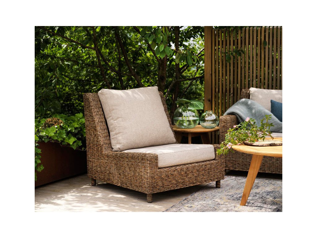 Elegantný a striedmy dizajn s príjemnými proporciami v uvoľnenom štýle New England. Dizajn so štýlovými rovnými líniami a novou rustikálnou béžovo prírodnou farbou. Vankúše z olefínovej tkaniny. Kreslo je vhodná do exteriéru aj interiéru alebo zimnej záhrady. Farba: béžová rustik so šedo béžovým textilným polstrovaním v Olefin úpraveMateriál: umelý ratan, polguľatý výpletRám: hliníková konštrukciaRozmery: UV ochrana a mrazuvzdornosť: ÁNOHmotnosť: 15 kgPríďte si ho vyskúšaťVystavený na predajni