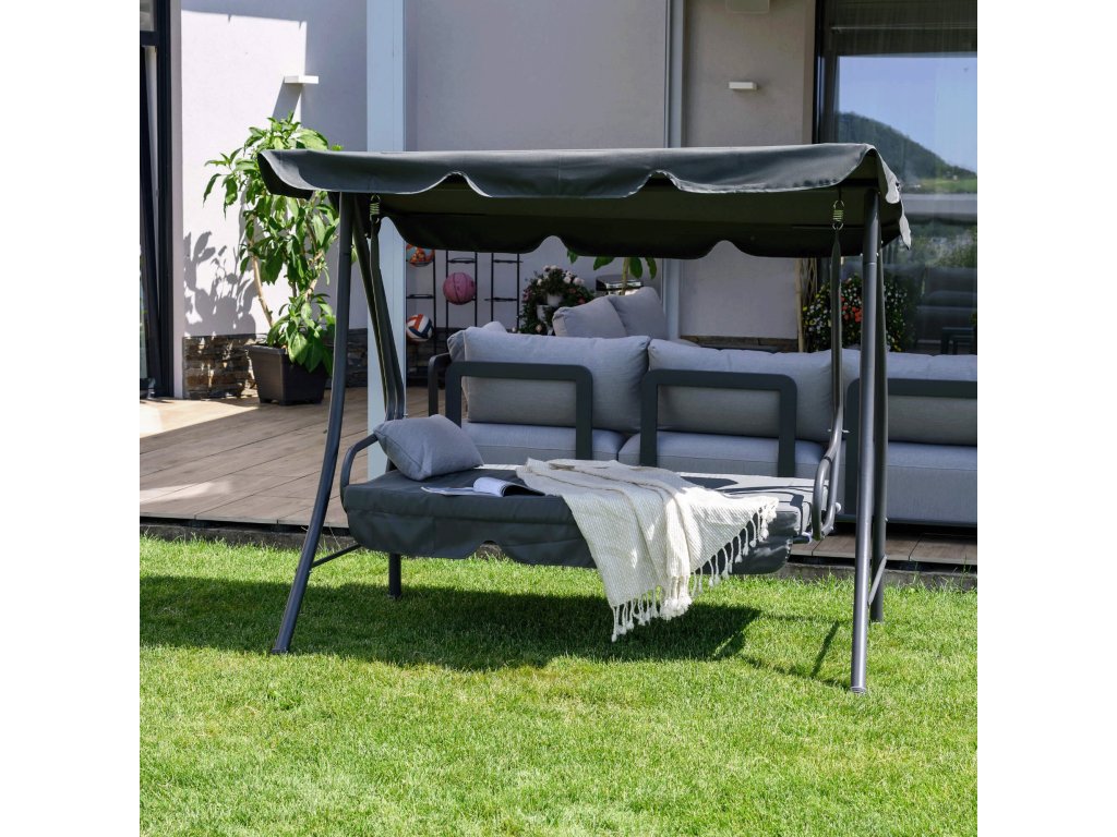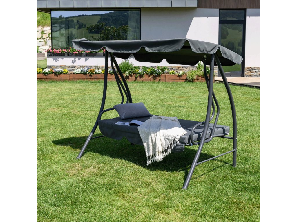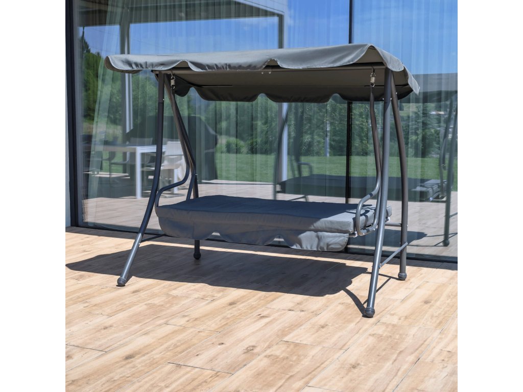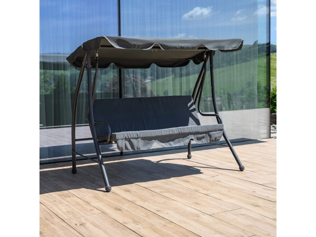 Materiál: kov/polyesterová tkanina Barva: šedá Rozměry (ŠxHxV): 201x120x167 cm Výška sedu: 48 cm Hloubka sedu: 53 cm Šířka sedu: 160 cm Výška zad: 54 cm Kovová konstrukce Možnost rozložení na ležení Rozměry ležení: 120x203 cm Nosnost: 200 kg Voděodolné potahy Tloušťka polštářů: 8 cm Prat ručně Potah upevněný suchým zipem Protiskluzové nožičky Dodáváno se stříškou Rozměr stříšky (ŠxV): 201x120 cm Bez možnosti nastavení sklonu Dodáváno v demontu