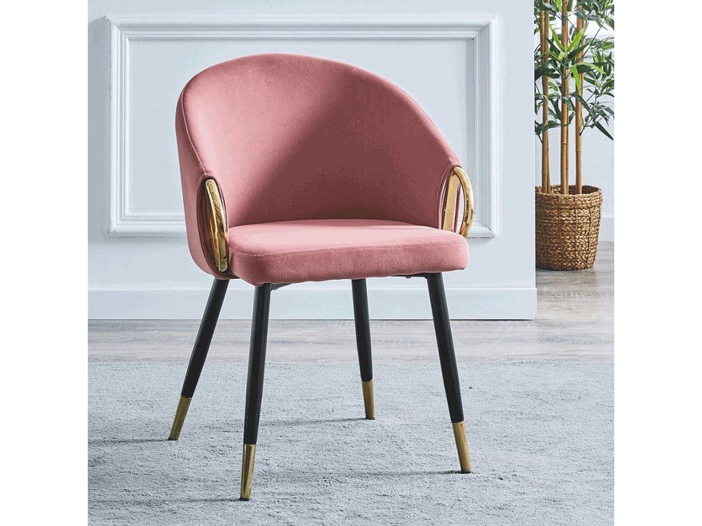 Materiál: velvet látka / černý kov / chrom Oděruodolnost textilie podle testu Martindale: 85 000 oděrek Barva: růžová / černá / gold chrom zlatý Rozměry (ŠxHxV): 55x56x78 cm Hloubka sezení: 46 cm Výška sezení: 47,5 cm Výška opěrky zad: 30,5 cm Šířka sedáku: 45 cm Výška opěrky rukou: 27 cm Výška zlaté části opěrky: 15 cm Výška od země po opěrku: 63 cm Nosnost: 90 kg Designové, luxusní Příruční Elegantní a funkční kovová konstrukce Nohy zakončené ohebnými kluzáky na vyrovnání nerovnosti povrchu Dodávané v demontu