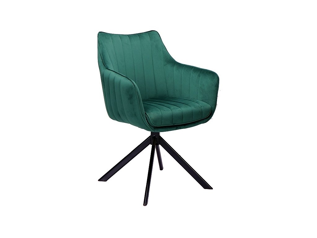 Atraktivní otočná čalouněná židle - křeslo, vhodná nejen do Vaší jídelny a kuchyně, ale také do kanceláře, čekárny či recepce. Kovová konstrukce je lakovaná černou matnou barvou, čalounění je z látky bluvel v zelené barvě s elegantním prošíváním. Židle se hodí ke stolům, které najdete v naší uvedené nabídce. Dodáváme v demontovaném stavu.Doplňkové parametry