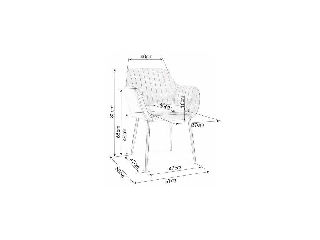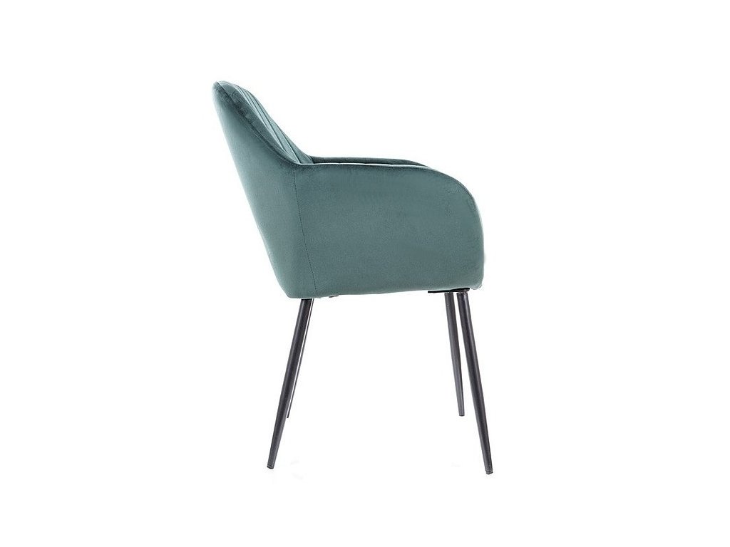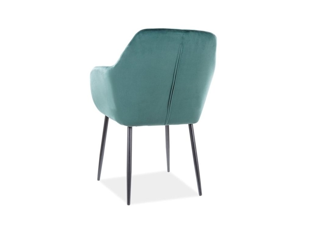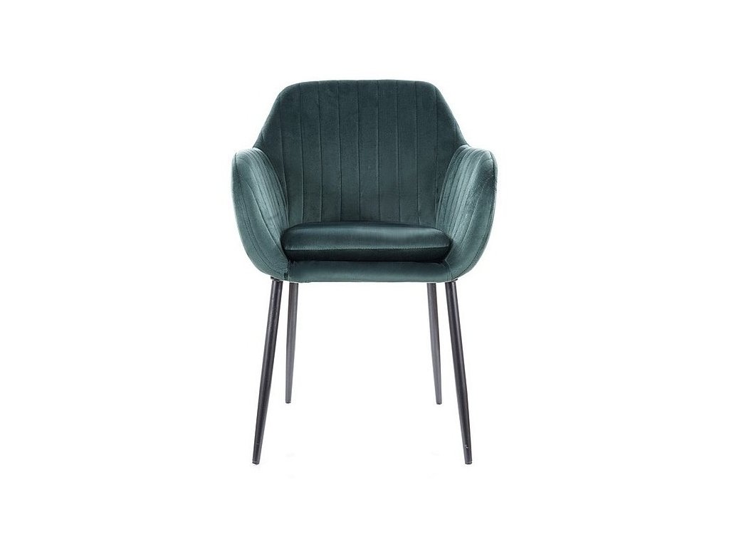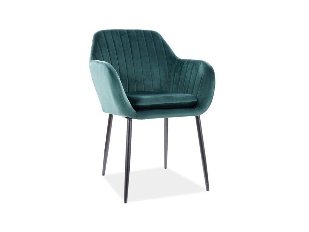 Elegantní čalouněná jídelní židle - křeslo. Konstrukce je z kovu v barvě černá mat. Čalounění židle je z potahové látky velvet aksamit v zelené barvě. Dodáváme v demontovaném stavu.Doplňkové parametry