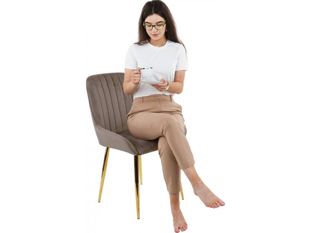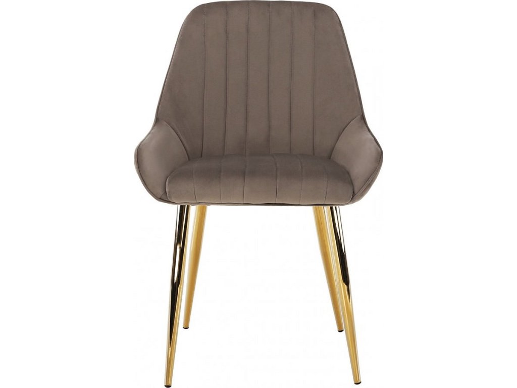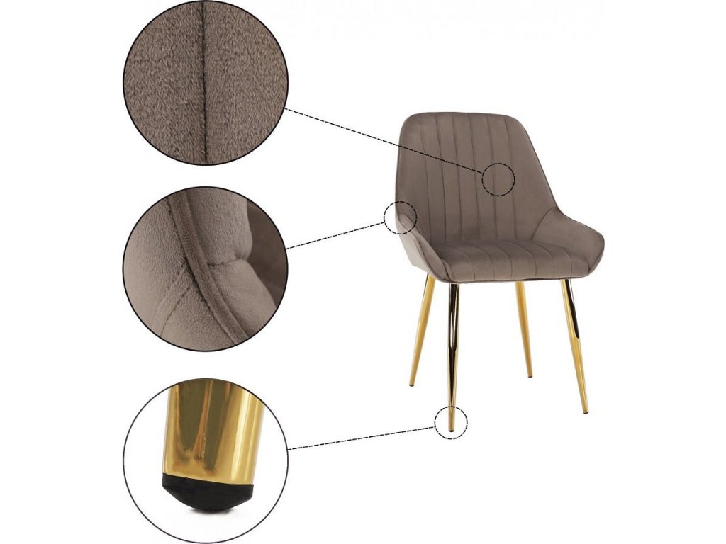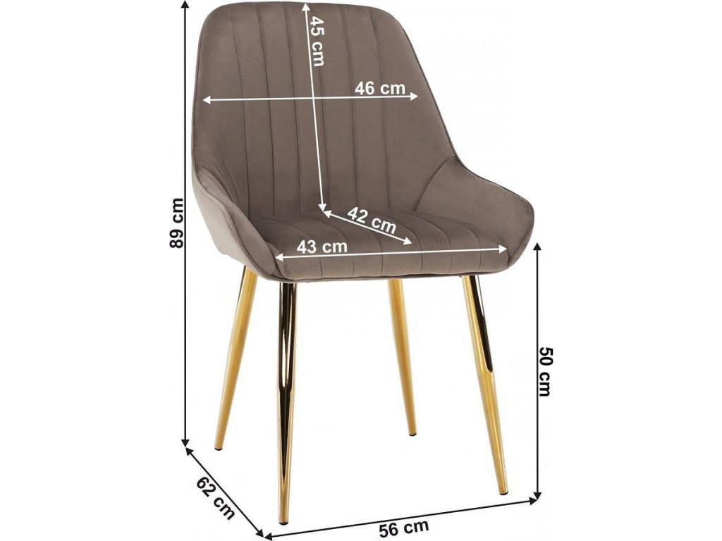 Materiál: látka Velvet / chrom Oděruodolnost textilie podle testu Martindale: 95 000 oděrek Barva: šedohnědá Taupe / gold chrom-zlatá Rozměry (ŠxHxV): 56x62x89 cm Výška sedu: 50 cm Hloubka sedu: 42 cm Šířka sedu: 43 cm Rozměry zádové opěrky (ŠxV): 46x45 cm moderní Nosnost: 90 kg atraktivní vzhled Obsahuje plastové krytky chránící podlahu Dodávané v demontu