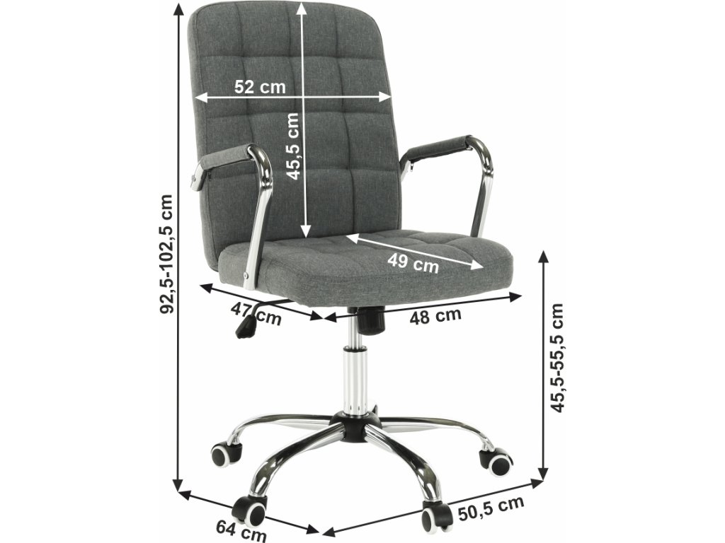 Kancelářské křeslo MORGEN Materiál: látka / kov Oděruodolnost textilie podle testu Martindale: 80 000 oděrek Barva: šedá / chrom Rozměry (ŠxHxV): 50,5x64x92,5-102,5 cm Výška sedu: 45,5-55,5 cm Hloubka sedu: 49 cm Houpací mechanismus: ano Nastavení výšky sezení: ano Látka: 100% polyester Hmotnost: 13,5 kg Nosnost: 100kg Opěrka zad (ŠxV): 45,5x52 cm Sedadlo (ŠxH): 48x47 cm Dodávané v demontu
