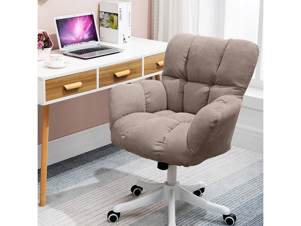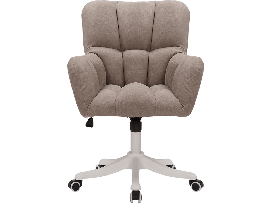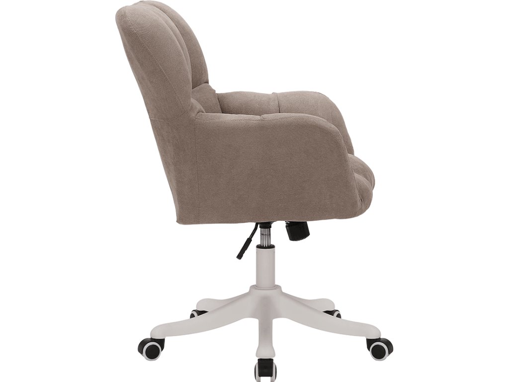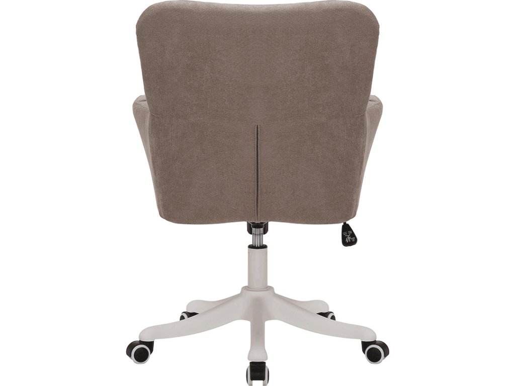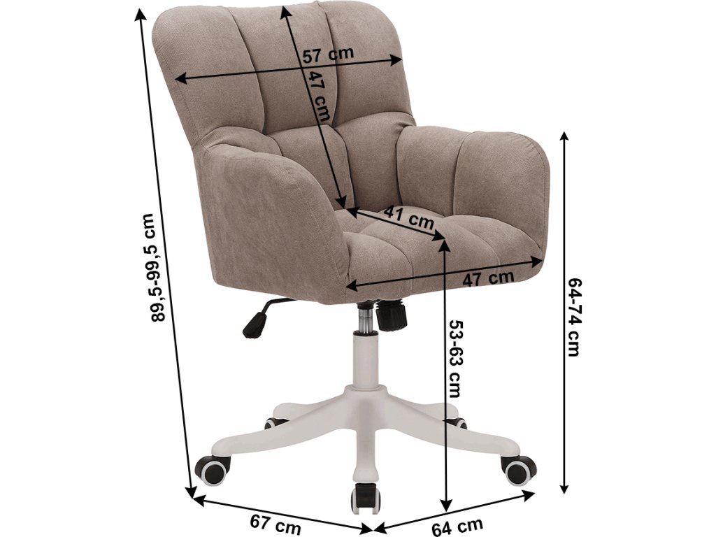 Materiál konstrukce: kov Barva: bílá Materiál čalounění: látka Oděruodolnost látky podle testu Martindale: 80.000 oděrek Barva: šedohnědá Taupe Rozměry (ŠxHxV): 64x66x89,5-99,5 cm Nastavitelná výška sedu: 53-63 cm Šířka sedu: 47 cm Hloubka sedu: 48 cm Výška zádové opěrky: 51 cm Šířka zádové opěrky: 60 cm Maximální nosnost: 110 kg S pístem Opěrky na ruce Dekorativní šití na opěradle a sedadle Plastová pětiramenná podstava Univerzální kolečka vhodná pro měkké i tvrdé podlahy funkce houpání Dodávané v demont