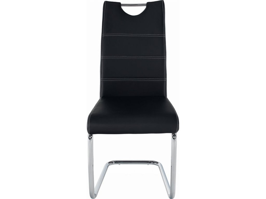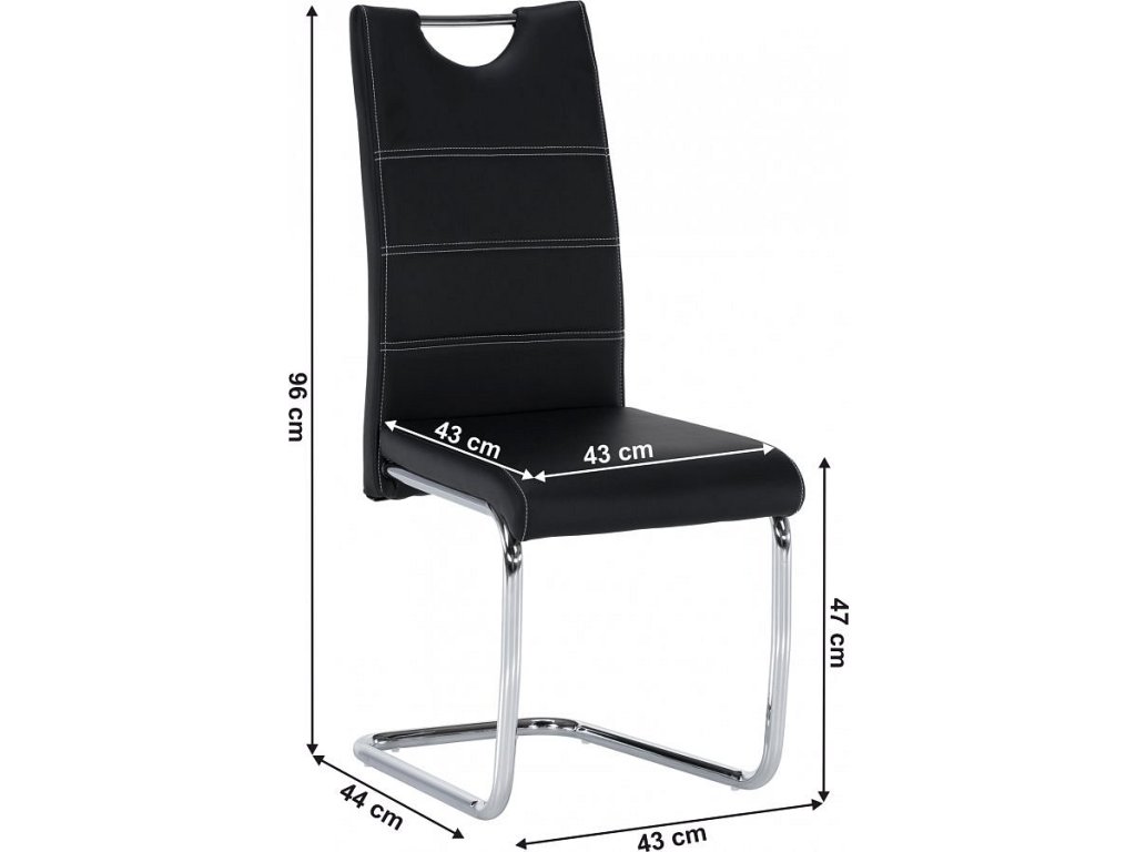 jídelní židle, materiál: ekokůže PU + chrom, Oděruodolnost textilie podle testu Martindale: 100 000 oděrek barevné provedení: černá. Rozměry ŠxHxV: 43x44x96 cm, výška sedu: 47 cm. Dodávané v demontu. Nosnost: 110 kg